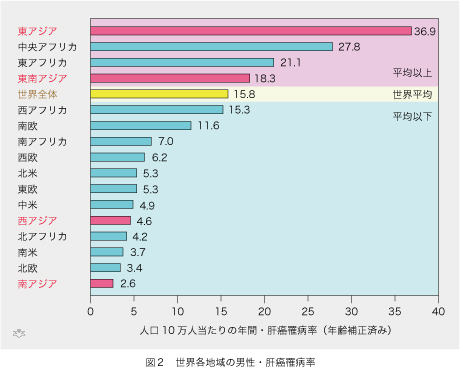 全ての悪性腫瘍の中で肝癌は4番目に頻度が高く、年間に100万人が死亡すると推定されています。原発性肝癌には肝細胞を母体とする肝細胞癌と、胆管上皮から発生する胆管癌がありますが、圧倒的多数を占める肝細胞癌を肝癌と総称することにします。肝癌の三大病因はHBV、HCVとアルコールで、他に原因不明の潜因性(cryptogenic)があります。従ってHBVの感染率が高いアジアで肝癌が多発するのは、当然と云えます。GLOBOSCAN(http://www-dep.iarc.fr/)は、世界保健機構(WHO)が支援する国際癌調査機関で、種々悪性腫瘍の国別・男女別罹患率(incidenceで一定期間 [通常は一年間] に疾患が発症する割合)を掲載しています。最新の掲載は2002年版ですが、それ以前に2~5年さかのぼる調査結果に基づいています。その上、国によっては調査が困難な状況もあるでしょう。しかし、一定の基準にもとづいた比較を可能とする、唯一のデータ・ベースとなっています。地域別の男性肝癌罹患率を高い順に並べてみました(図2)。世界の平均は10万人当たり年間15.8人で、女性での5.8人の約3倍の頻度となります。中国、日本と韓国を含む東アジアの男性肝癌罹患率は36.9人で、図抜けて高い頻度です。インドネシア、ベトナム、フィリピン、タイとミャンマーを含む東南アジアも18.3人で、世界平均の15.8人を上回っています。これと対照的に、インド、パキスタンとバングラデシュを含む南アジアの肝癌罹患率は、世界最低の2.6人に過ぎません。このためにアジアを一括りにはできないようなのです。