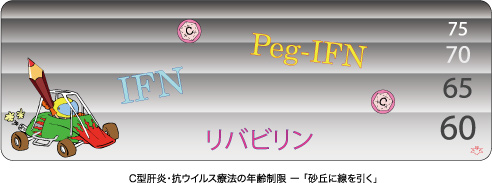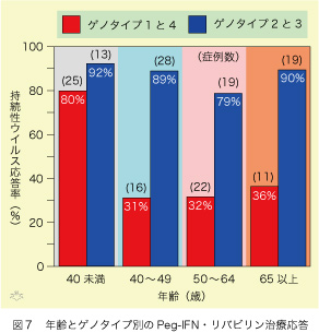 ウイルス性要因も重要で、ゲノタイプ1・高ウイルス量(100キロ国際単位/mL以上)以外では治療応答にさほどの違いがみられません(表2の2)。ゲノタイプ別の加齢に伴う応答差は40歳から既に認められ、それ以降は拡大しないことが報告されています(図7)。連続変数である加齢に、特定の年齢で線引きをすることは、所詮できにくいでしょう。歳をとるにつれ同じ年齢でも体力・精神力を含めた実効年齢の個人差がますます大きくなるでしょうし、悪影響因子の影響も強くなるでしょう。年齢区分は、砂丘に線を引くような所作で、悪天候がくれば吹き飛んでしまいますし、しかも高い所ほど影響が強いでしょう。加齢がC型肝炎の薬剤治療応答に及ぼす影響も、対象患者の選択によって治療成績が大きく違い、しかも高齢では若年よりその差が出やすいのでしょう。一律に年齢で括った治療ガイドラインを設定することはもはや不可能で、きめ細かい設定が必要となるでしょう。高齢C型肝炎の症例数では群を抜いて全世界の先頭に立つ日本に背負わされた、重要な課題と思われます。日本では、高齢者のC型肝炎治療成績を向上させるために、いろいろな改善策がとられています。その一例として、HCV遺伝子型が1bで高ウイルス量の高年者C型肝炎患者でも、ペグIFNとリバビリンの治療期間を通常の48週から72週に延長することによって、若年者に匹敵する高い応答率が得られています。