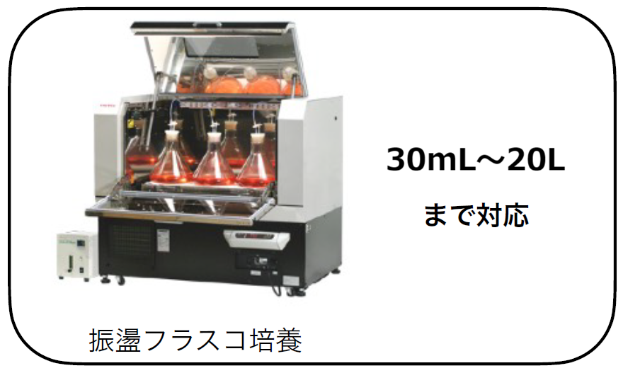 チューブリアクターでは5~30mL、振盪フラスコでは30mL~20Lの培養が可能です。