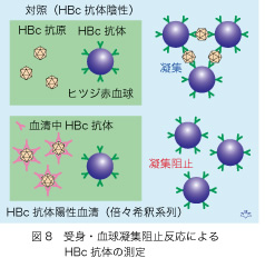HBc抗体の力価測定は日本のお家芸で世界中でこれによる献血スクリーニングを施行している国は他にありません。開発当時から、簡単な受身血球凝集阻止反応でHBc抗体が測定されています(図8)。ヒツジ赤血球を薬剤で固定してそれにHBc抗体をまぶしたものを用意します。これにHBc抗原(コア粒子)を加えますと、それを架け橋としてヒツジ赤血球が凝集し、肉眼でもはっきり判定できます。ところが、HBc抗原をあらかじめHBc抗体と反応させておくと両者が結合してしまうため後に加えたヒツジ赤血球の凝集が阻止されます。献血者の血清を2倍ずつ希釈しておいて、どの希釈(2N)まで凝集が阻止されるかを調べれば、HBc抗体の力価を測定できます。