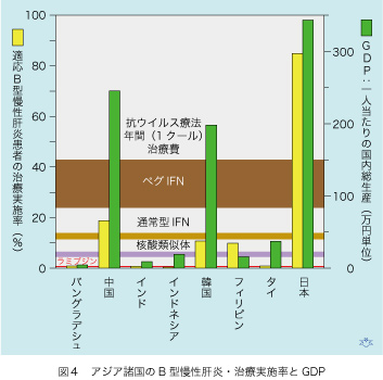 HBV持続感染に伴う肝癌の発症は、B型肝炎を早期発見し抗ウイルス療法(インターフェロンと核酸類似体)で治療することによって予防できます。HBVの増殖を抑え、血中のHBV DNAを低い値に保っておくと、肝癌が発症する危険が低いのです。抗ウイルス療法の適応があるB型慢性肝炎患者がアジアにどの位いて、そのうち何人(%)が実際に治療を受けられるか、の現状を知っておく必要があります(図4)。日本の肝炎医療がどれほど充実しているかがお分かり頂けると思います。悲しいことに、日本以外は多くのアジア諸国で治療実施率が1%以下に止まっています。その原因は国内総生産(GDP)の違いと、国によってGDPを遥かに超える抗ウイルス療法の法外に高い年間(あるいは1クールの)治療費にあります。 |